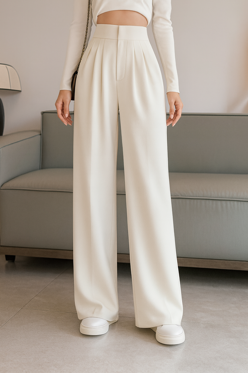 The Celeste High-Waist Wide-Leg Trousers blend tailored precision with fluid movement. Featuring a high-rise waist and gentle pleats that create an elongated silhouette, these trousers evoke quiet luxury and contemporary sophistication. Lightweight and versatile, they transition seamlessly from day to evening, offering refined ease for any occasion.