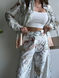 The Eclipse Ensemble – Celestial Elegance captivates with its sophisticated sun-and-moon motifs, bringing a touch of cosmic charm to contemporary styling. Crafted from smooth, lightweight satin-effect fabric, this two-piece set features a relaxed-fit shirt paired with graceful wide-leg trousers, enhancing both comfort and effortless chic.